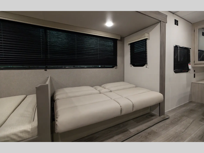 Sleeps 9 Slides 1 Length 33 ft 5 in Ext Width 8 ft Ext Height 11 ft 1 in Int Height 6 ft 9 in Hitch Weight 862 lbs GVWR 9962 lbs Dry Weight 6299 lbs Cargo Capacity 3663 lbs Fresh Water Capacity 44 gals Grey Water Capacity 40 gals Black Water Capacity 30 gals Furnace BTU 35000 btu Number Of Bunks 2 Available Beds Queen Refrigerator Type 12V GE Stainless Refrigerator Size 10.7 cu ft Cooktop Burners 3 Number of Awnings 1 LP Tank Capacity 20 lbs Water Heater Type Tankless On Demand AC BTU 13500 btu Awning Info 21' Electric w/Multicolor LED Light Strip & Remote Axle Count 2 Number of LP Tanks 2 Shower Type Tub/Shower Combo Electrical Service 30 amp Similar Floorplans