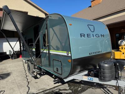 The Reign travel trailers by Keystone are premium single-axle units that are sure to make an impression at the campground. Each one is built with an exclusive automotive-finished aluminum exterior, a walkable roof, and a 100% composite floor for added durability. There are also tinted safety glass windows, quick drop stabilizer jacks, and an exterior shower with hot and cold water. The European inspired interior design is unique and cozy, and the 78" interior height will give you plenty of space to move about. You will also enjoy the ultra bright LED light strip and solid surface countertops in the kitchen, along with blackout night shades, and many more interior comforts.
