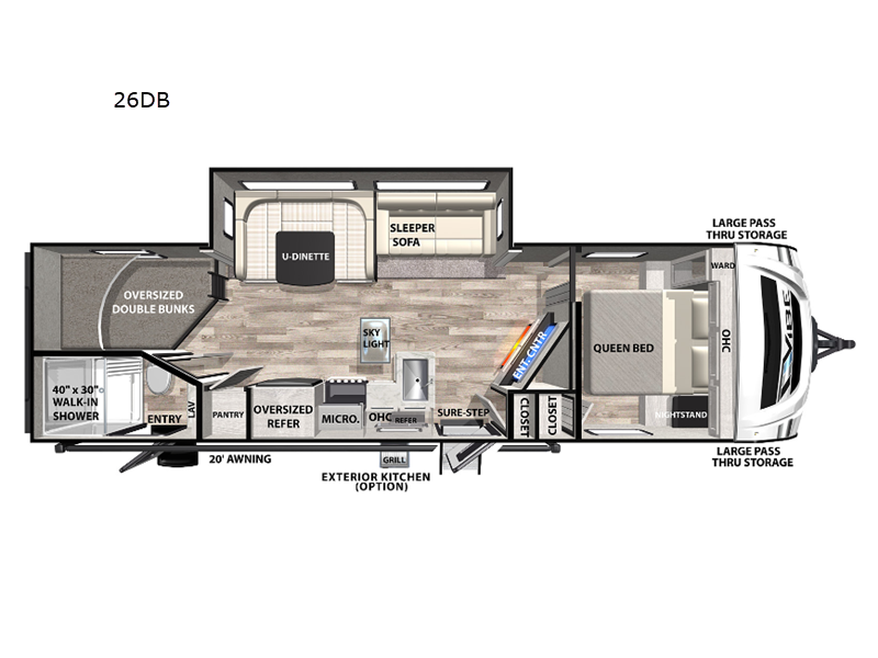 This dual entry travel trailer can comfortably sleep ten people each night, so invite the whole family along! The large slide out in the main living area will open up the space so the chef can cook on the three burner cooktop and the kids can watch cartoons on the entertainment center. This model also has an exterior kitchen option with an exterior refrigerator and a grill to fry up some bacon. When it's time to catch some zzz's, the kids or your guests can take the double-size bunks, while you and your spouse claim the queen bed to yourselves. And don't forget there is additional sleeping space on the U-shaped dinette and sleeper sofa!